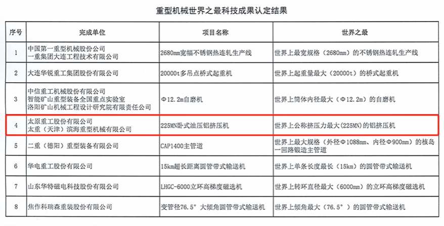 近日,中国重型机械工业协会组织认定的“重型机械世界之最科技成果”名单出炉,由太重自主设计研发的“225MN卧式铝挤压机”成功入选,再次展现了太重在锻压设备领域无可争议的领先地位。