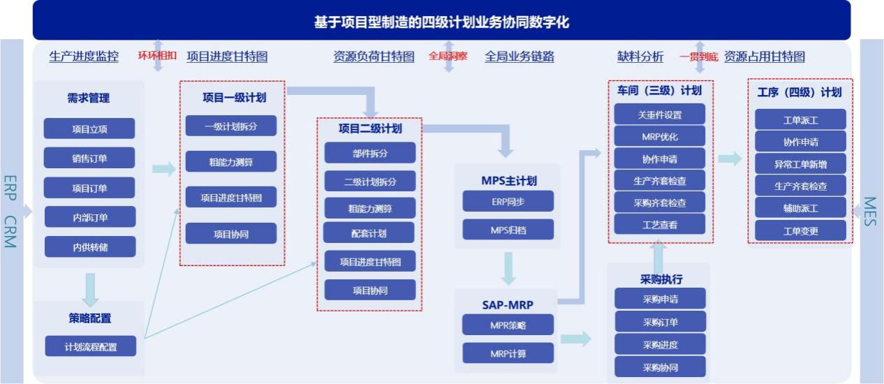 太重MOM平台,通过引入数字化手段,构建了一个横跨制造管理、生产单元、采购配套等多业务环节的综合管理系统。该系统采用了分级计划管理模式,结合倒排和顺排计划方式,形成了“横向到边、纵向到底”的四级计划体系。一级项目计划关注产品从设计、工艺、采购、生产、发运到安调等全过程的节点控制;二级大部件计划则根据一级计划的节点要求,结合生产经验和产能评估数据,设定大部件各工序的完成节点;三级零部件生产计划和四级工序任务计划聚焦零部件级别的生产执行,依据ERP系统输出的生产订单,进行生产派工、调度、执行等实际业务操作。这四层计划紧密相连,不仅提升了项目型制造的生产运营管理效率,还实现了生产计划的精细化管理和高效协同。