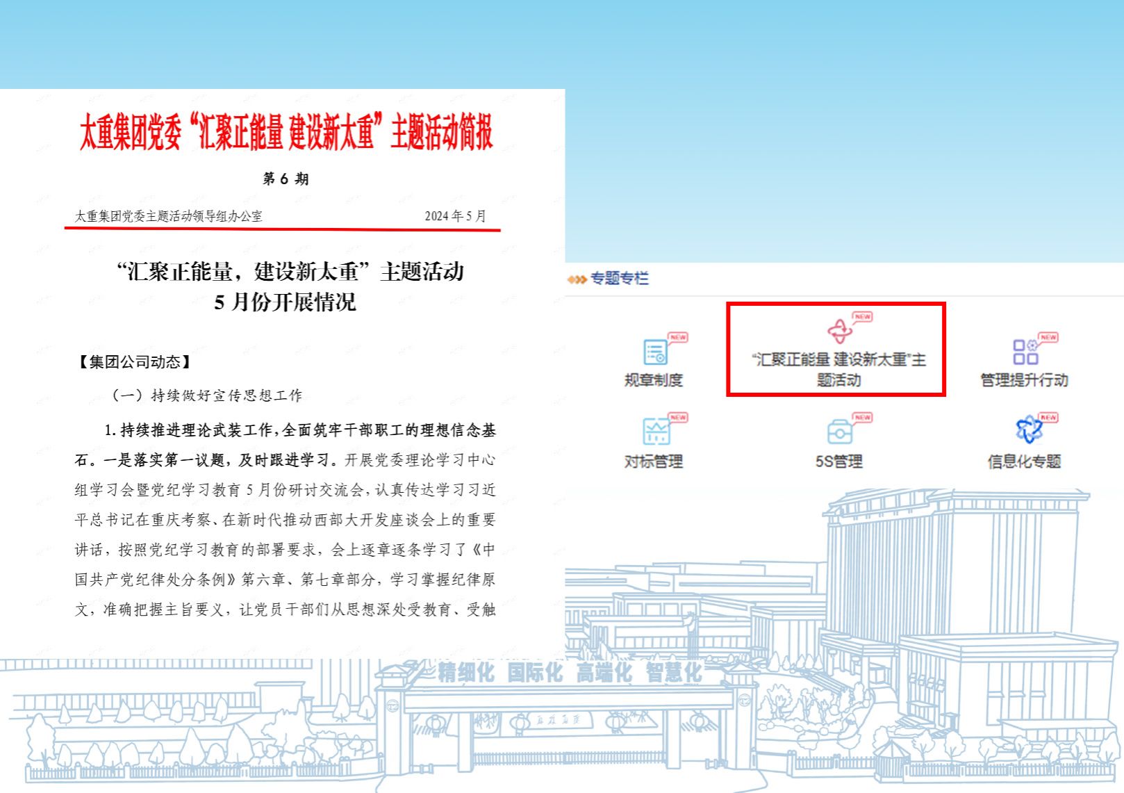 公司匠心宣讲队深入基层一线、车间班组开展形式多样的宣讲活动,传播职工奋斗事迹,让宣讲活动既“硬核”又有趣;主流媒体纷纷将镜头对准太重,多角度展示太重培育和发展新质生产力的蓬勃力量。