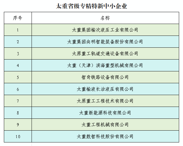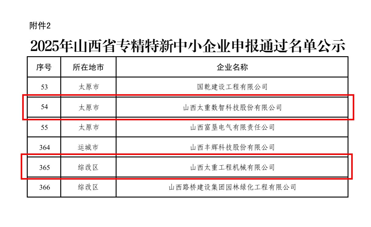近日,山西省2025年专精特新中小企业名单正式公布,山西太重数智科技股份有限公司、山西太重工程机械有限公司双双上榜!至此,太重省级专精特新中小企业已达10家!